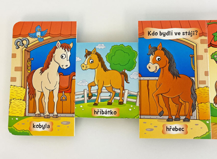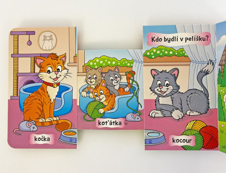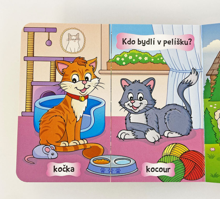 Poutavě ilustrovaná kniha plná zvířátek a jejich domečků. Vysunutím pohyblivé části jednotlivých stran děti hravým způsobem odkryjí, která mláďátka patří dvojici zvířat.