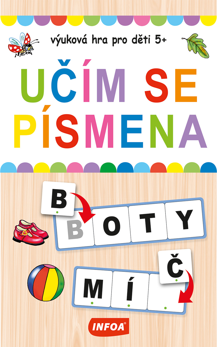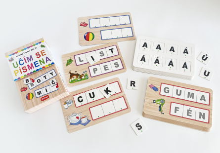 Zábavná vzdělávací hra pro předškoláky a školáky. Jedna strana karty má pro jednodušší nácvik předtištěná písmena, na druhé straně jsou prázdná bílá políčka. Pro správné umístění písmen jsou žetony označeny zelenými puntíky. Rodiče podle schopností dítěte mohou určit, z kolika žetonů může dítě písmena vybírat. Cílem hry je poznávání písmen a skládání slov. Krabička obsahuje 13 oboustranných karet a 96 žetonů s písmeny.